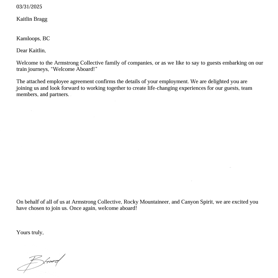 Category D – Work Experience Employment over 250 hours (5 points) Rocky Mountaineer ( 396:55 Hours Worked)